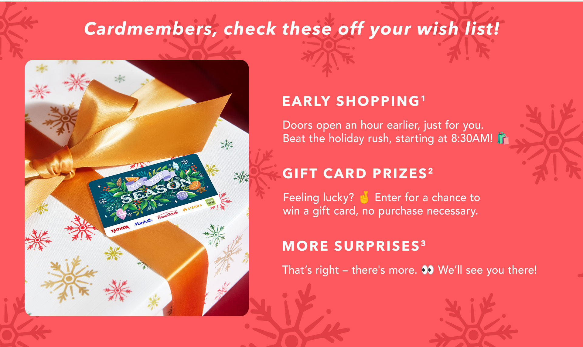 2NO PURCHASE NECESSARY; CUSTOMER PROMOTION TAKES PLACE AT TJX BRAND STORE LOCATIONS DURING DESIGNATED “MEMBER MORNING” EVENTS THAT ARE ANNOUNCED THROUGHOUT THE YEAR; OPEN ONLY TO U.S., D.C. AND PUERTO RICO RESIDENTS, 18+ AND NOT A MINOR WHO ARE A TJX REWARDS CREDIT CARD HOLDER. SEE LOCATOR.TJXREWARDS.COM/TJXREWARDS-GIFTCARD-SWEEPS-RULES.PDF FOR OFFICIAL RULES AND COMPLETE DETAILS. VOID WHERE PROHIBITED. SPONSOR: THE TJX COMPANIES, INC. SYNCHRONY BANK IS NOT A SPONSOR OF THIS PROMOTION.